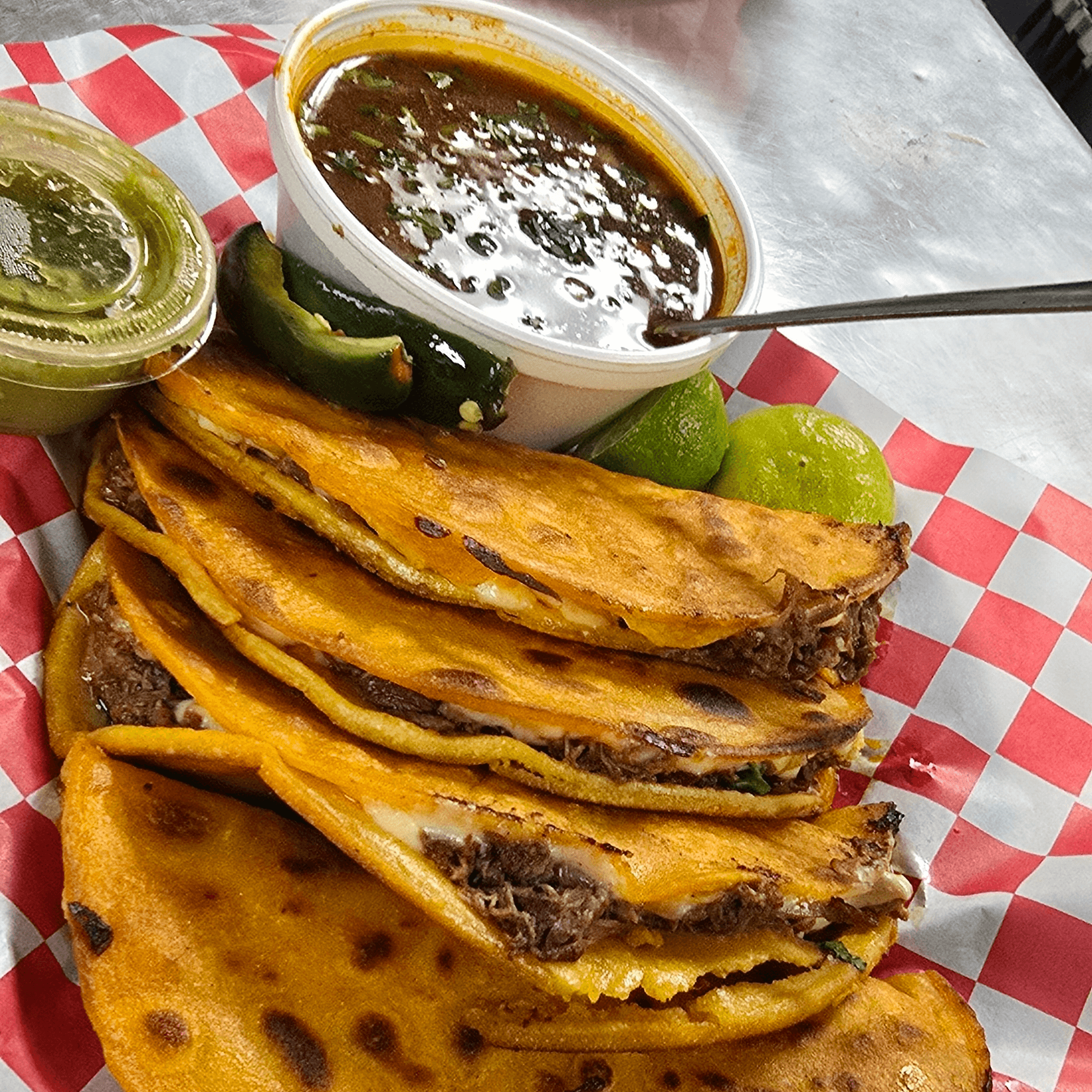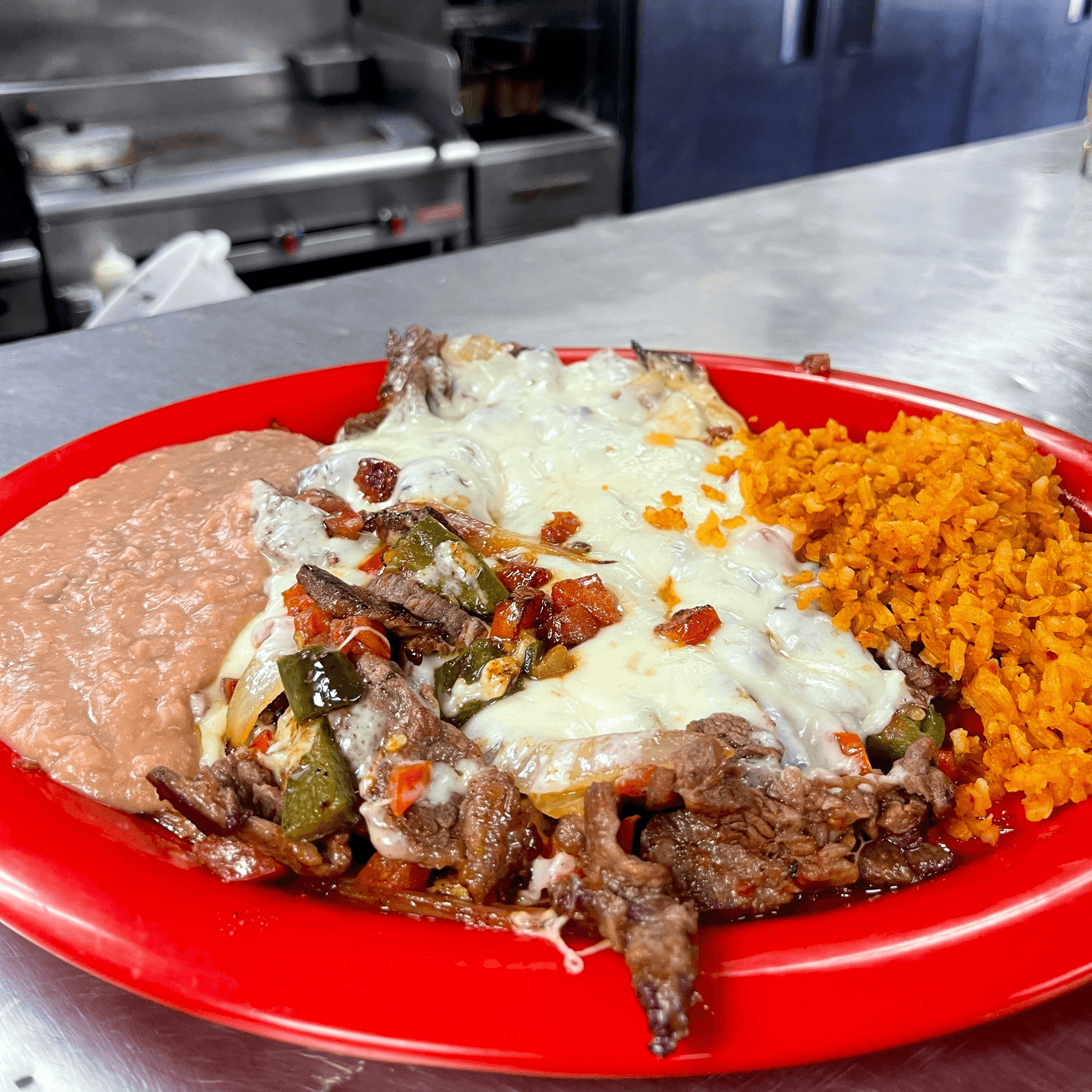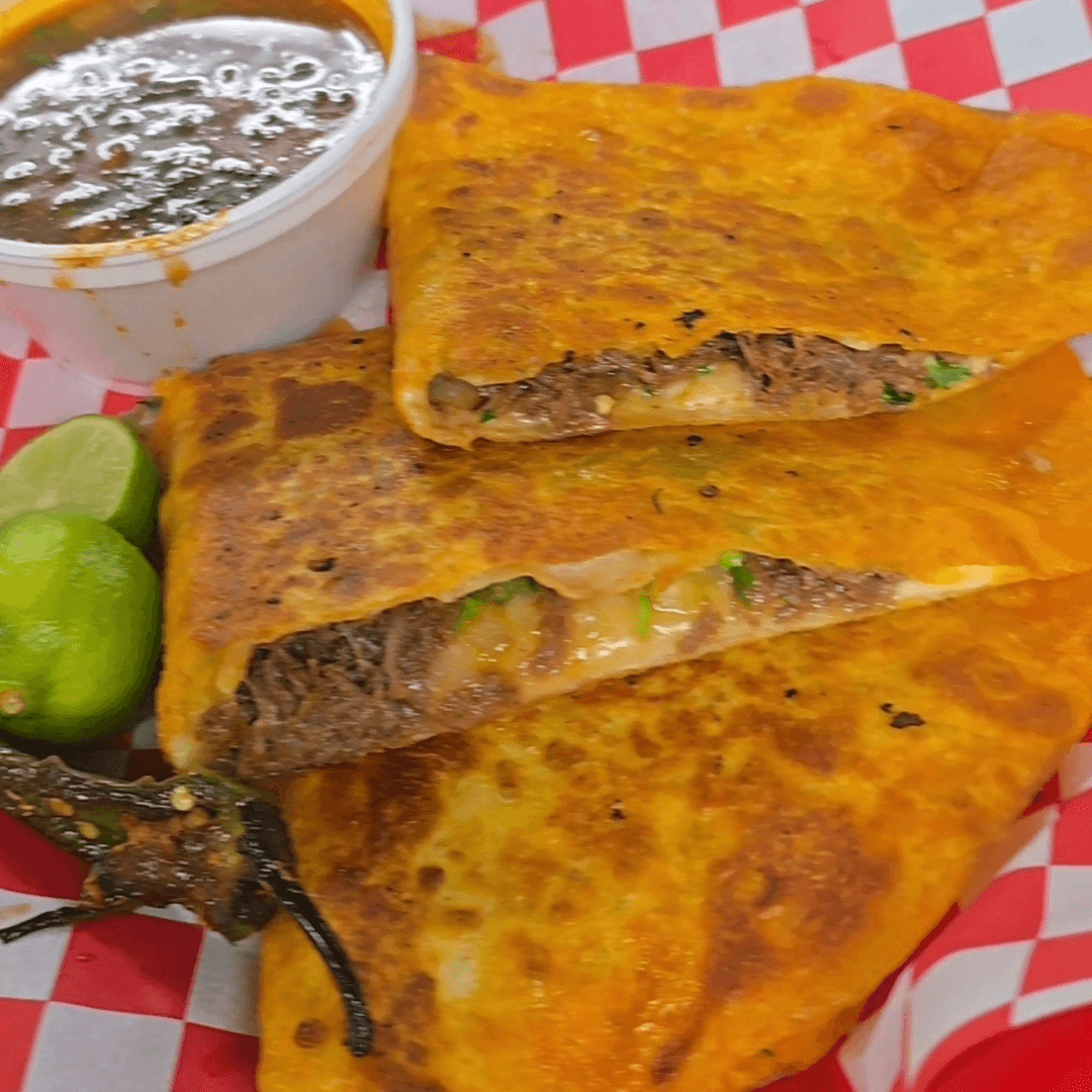 Grilled steak, chicken, chorizo, rice, beans, cactus and 2 cheese quesadillas