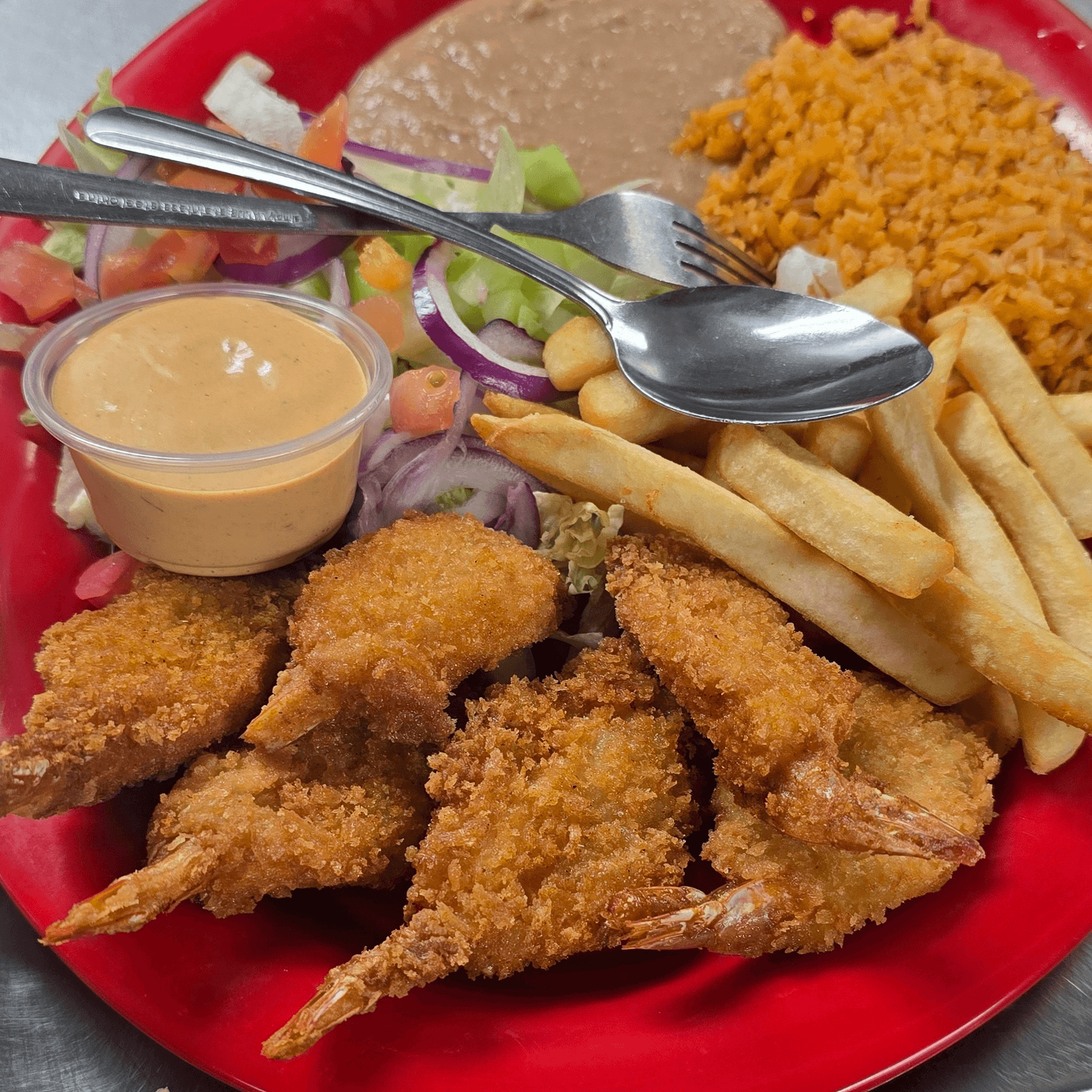 Breaded Shrimp, Rice, Salad, French fries and avocado