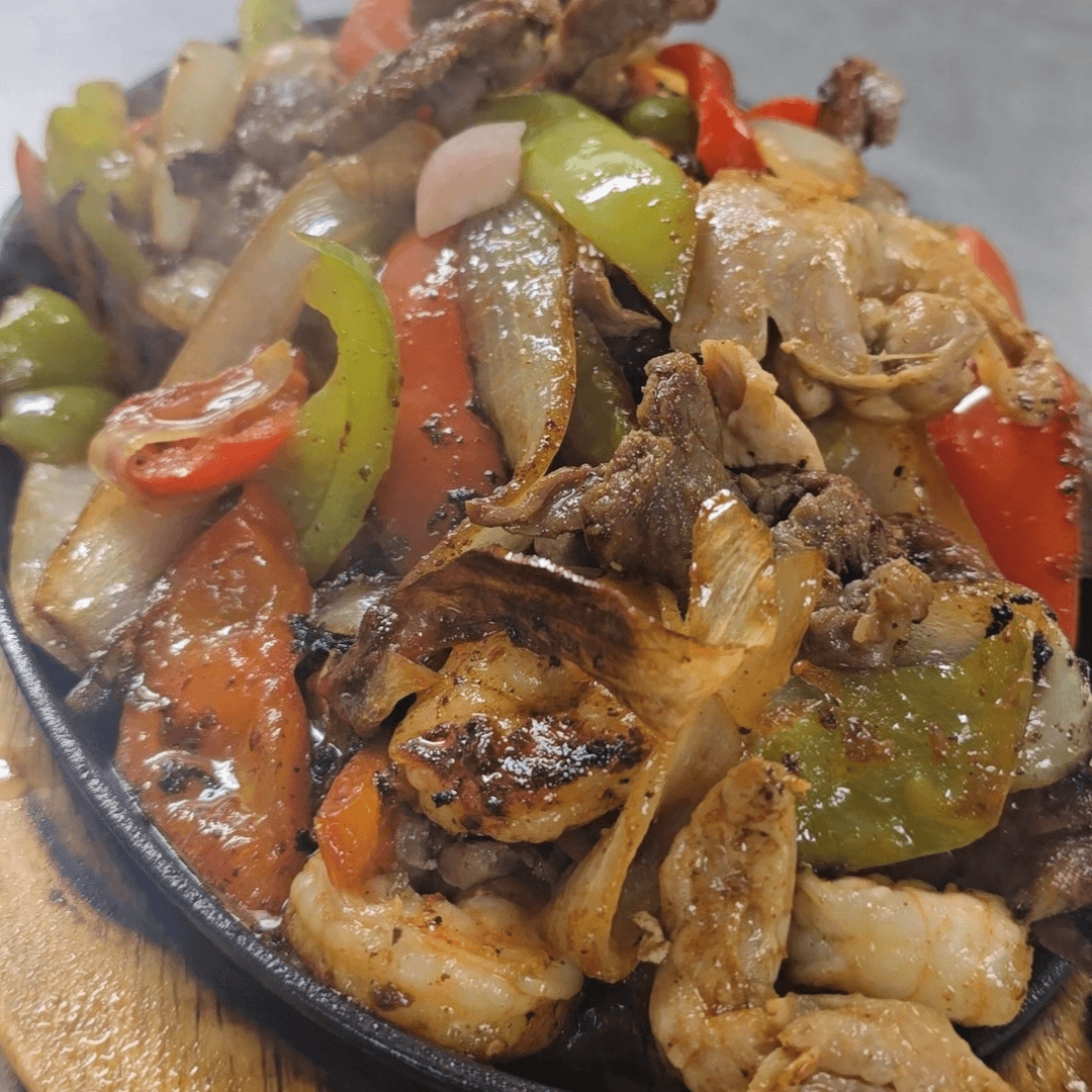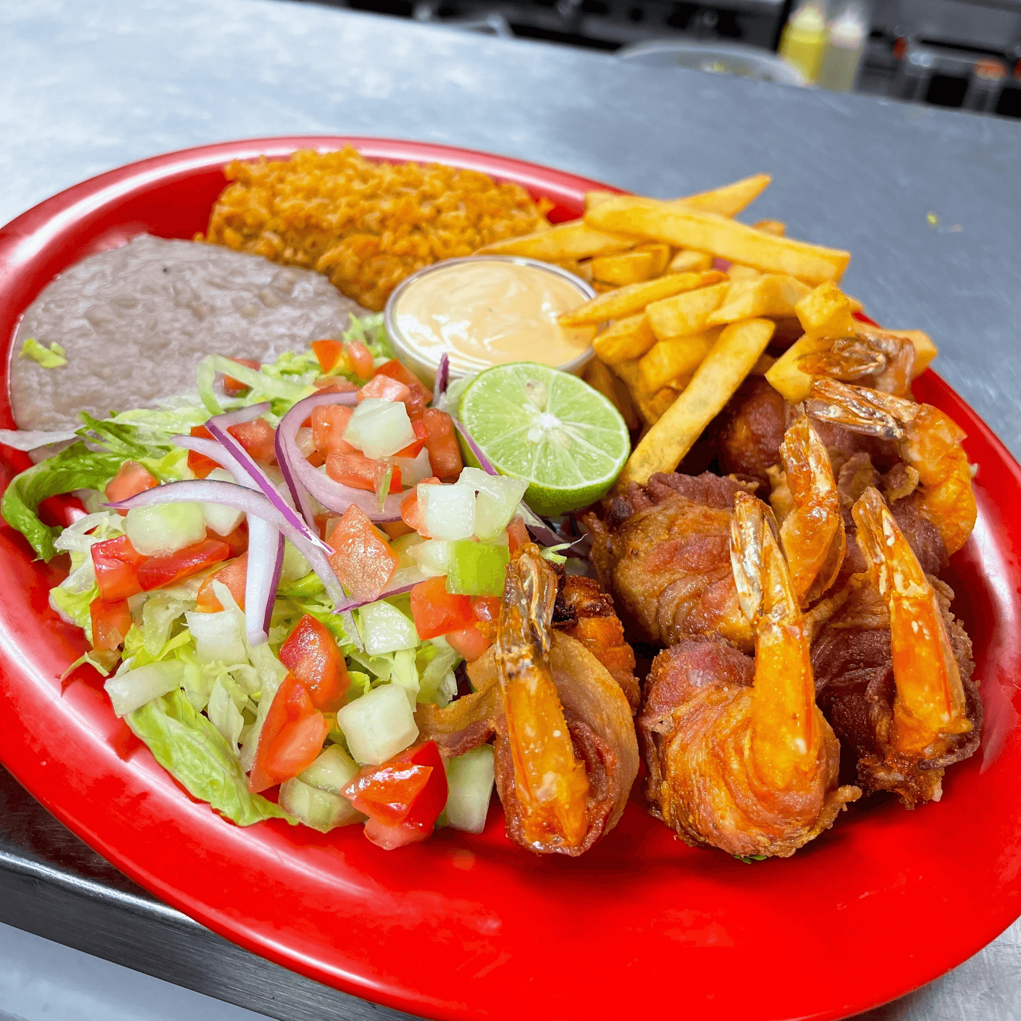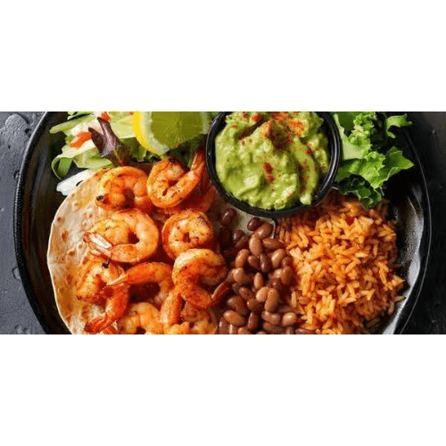 Mixed shrimp, chicken and beef. With rice, beans, salad, guacamole and cream.