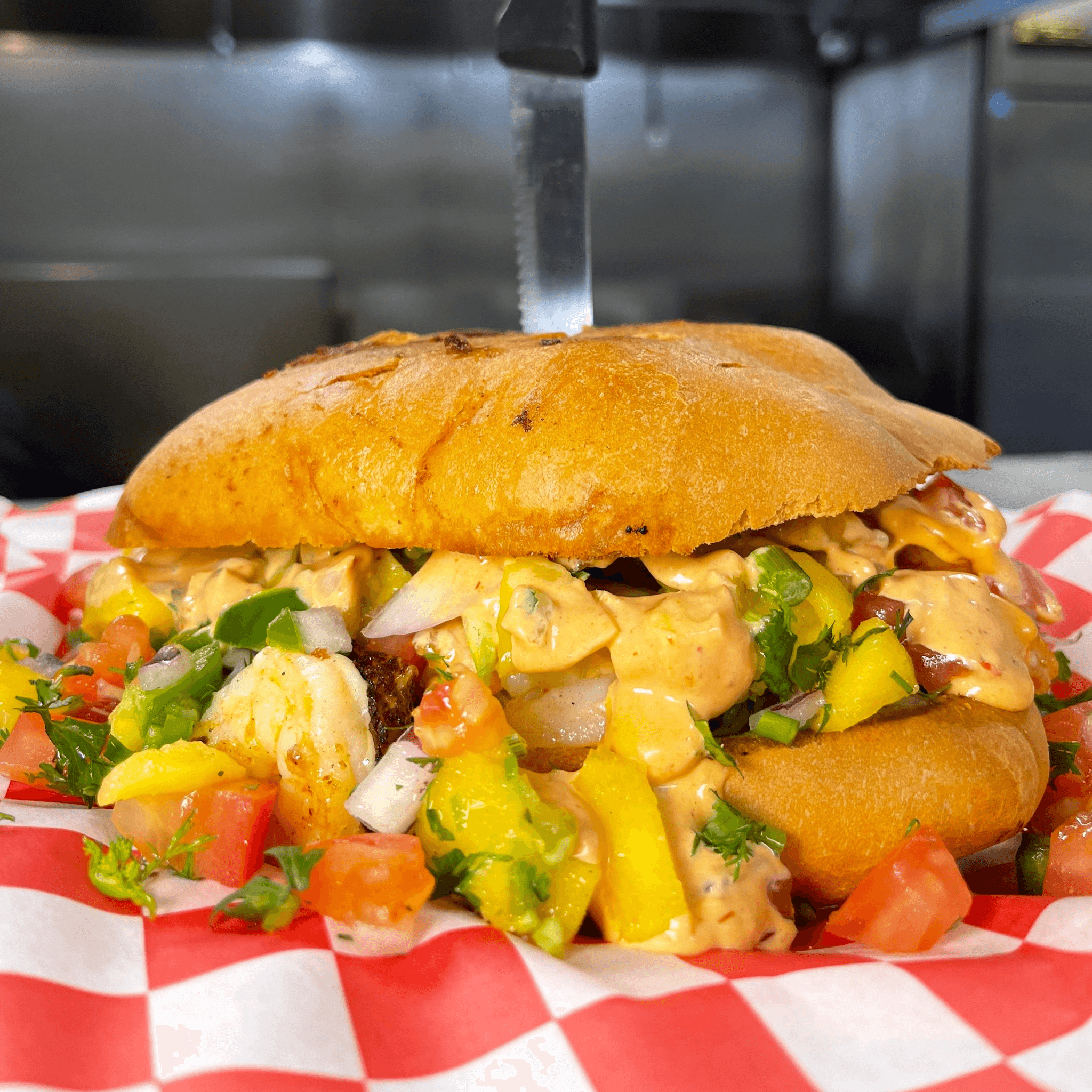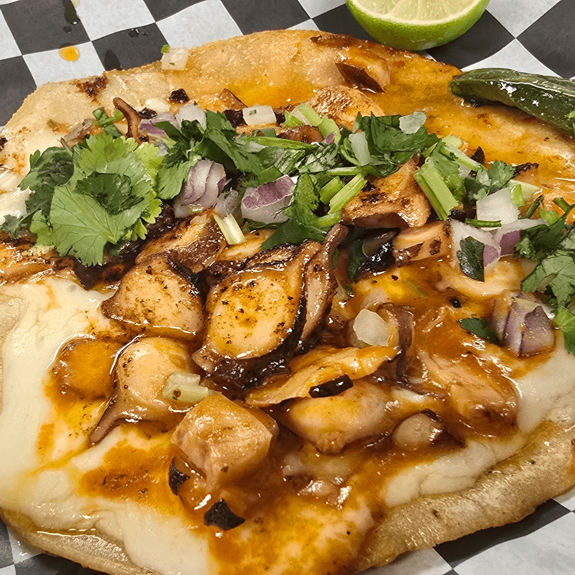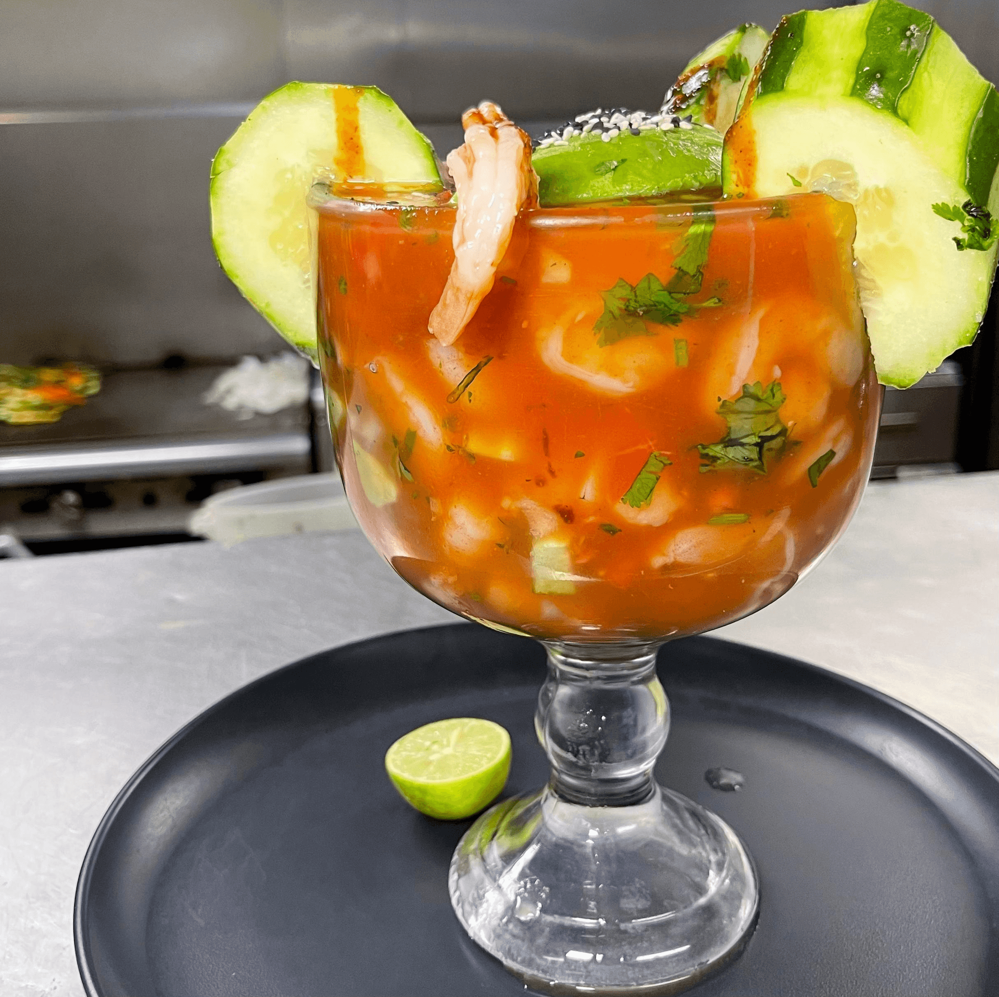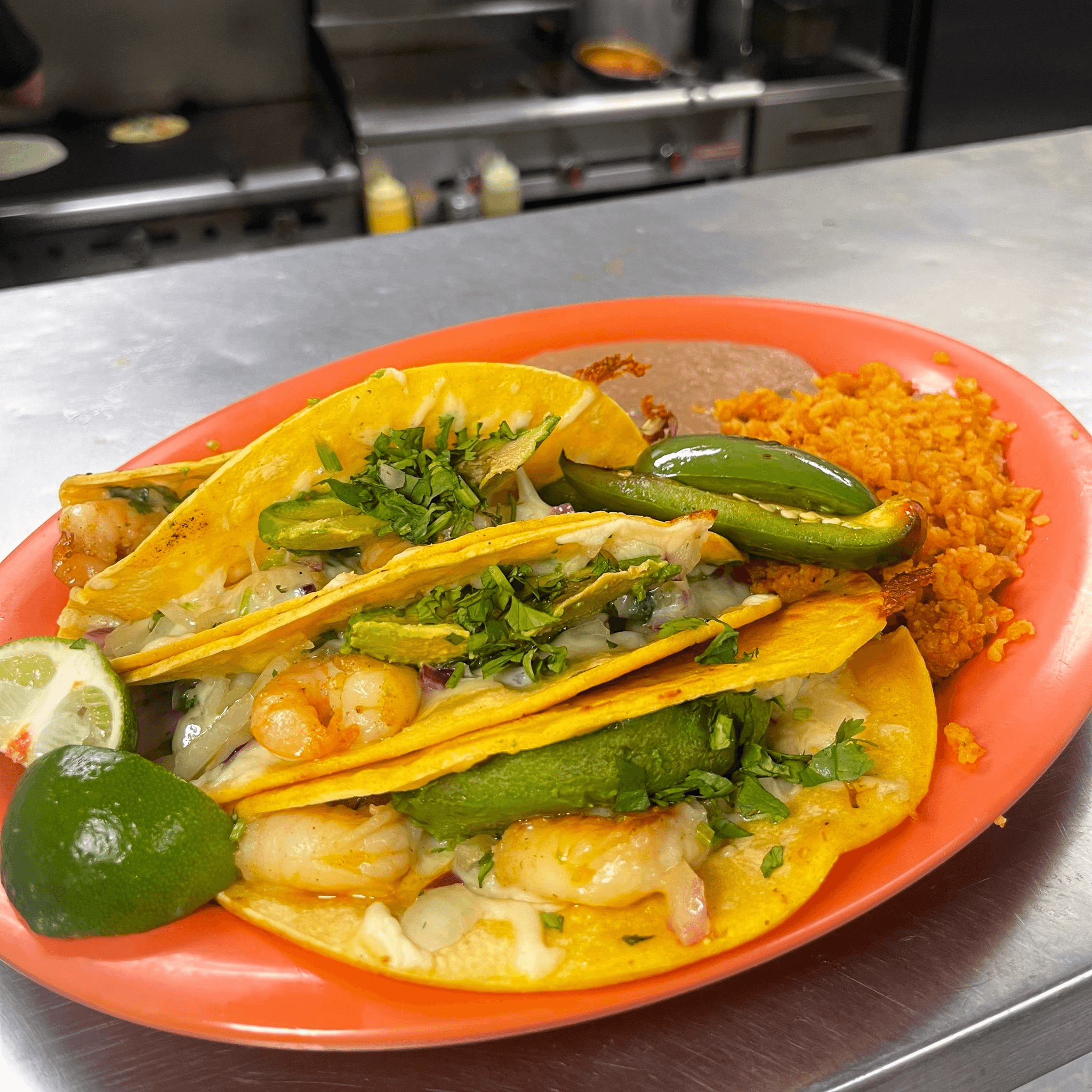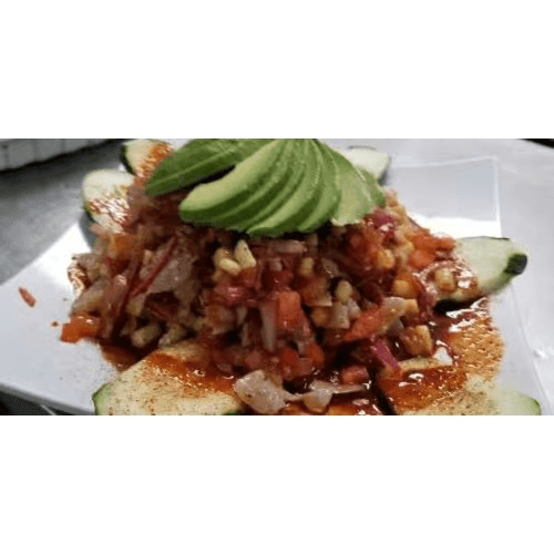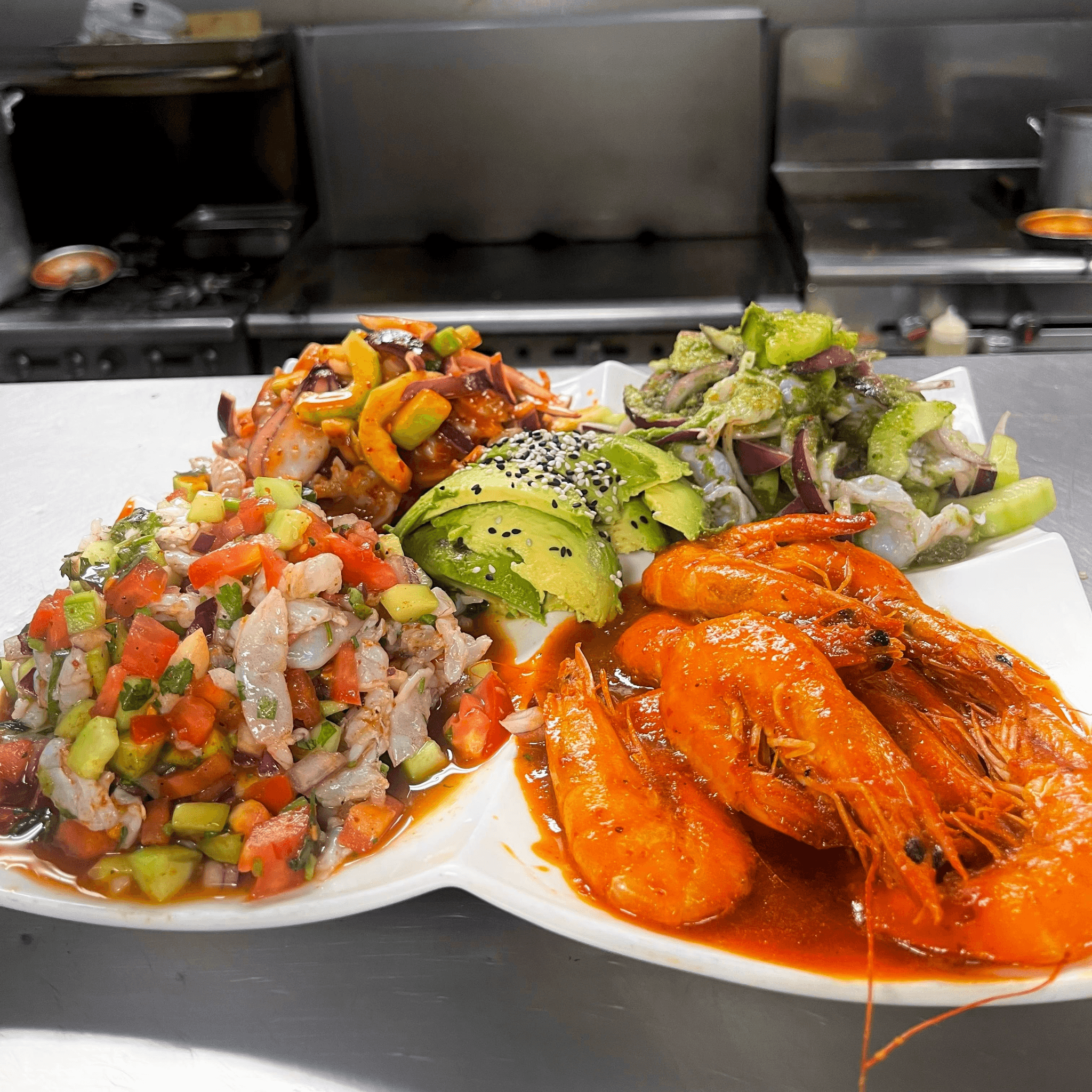 Shrimp, cheese, mango, jalapeno, onion, cilantro and special sauce and avocado