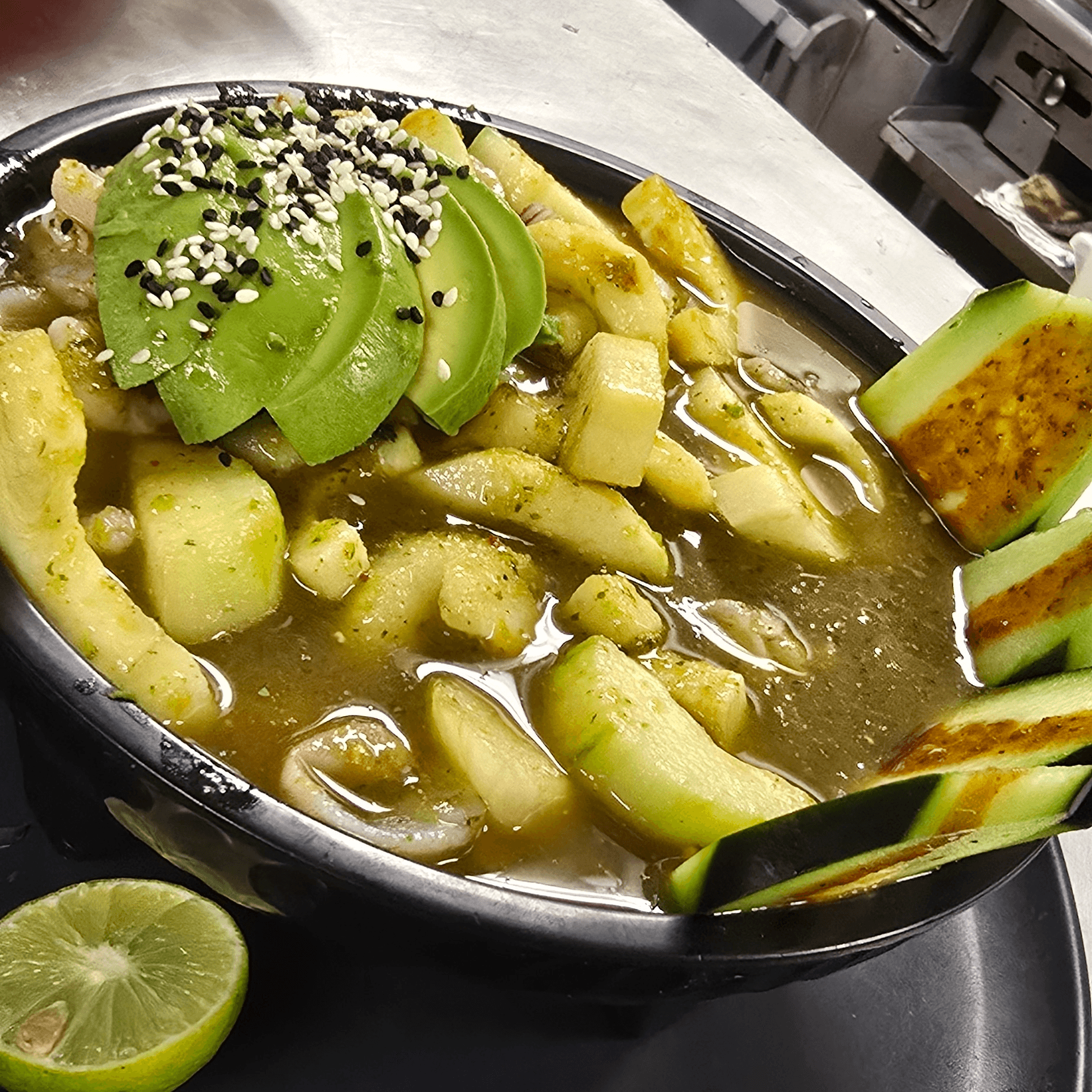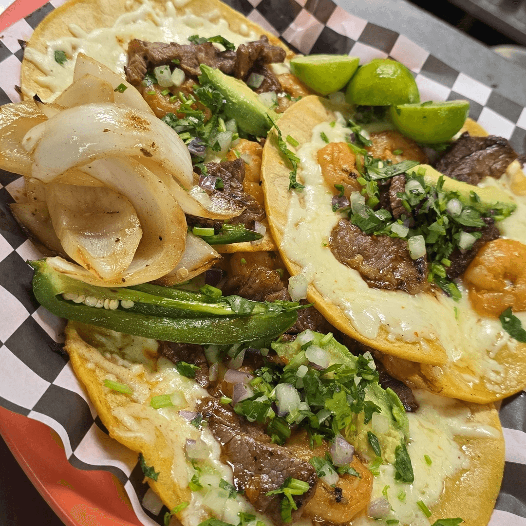 Camaron, carne asada, queso, aguacate, cilantro y cebolla