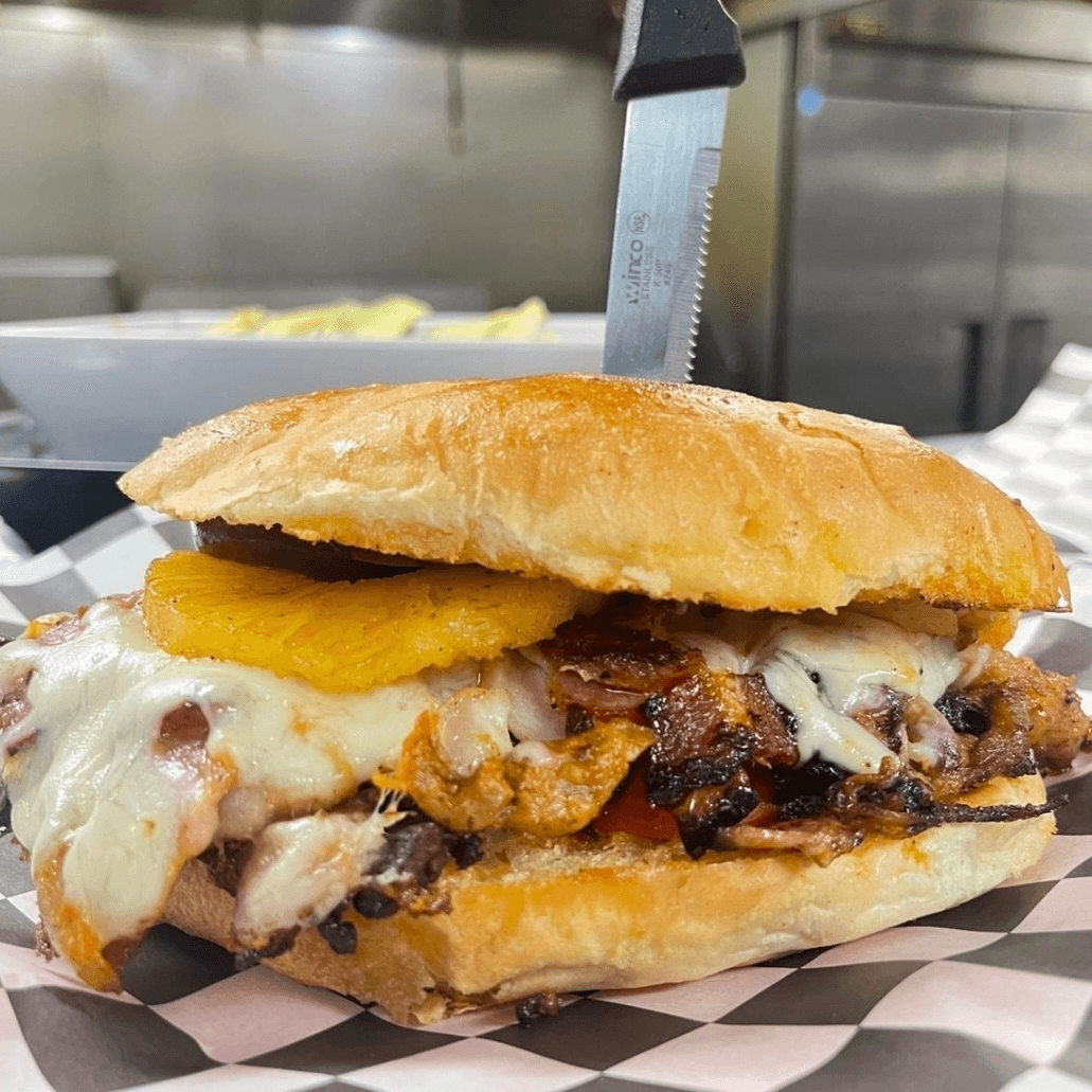 Marinated pork, ham, bacon & pineapple