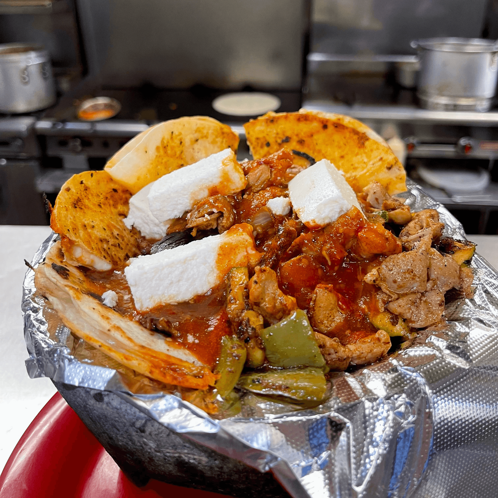 Red or green. Asada, pollo, pastor, carnitas, rice, beans, onion, cilantro, sour cream, salsa and cheese