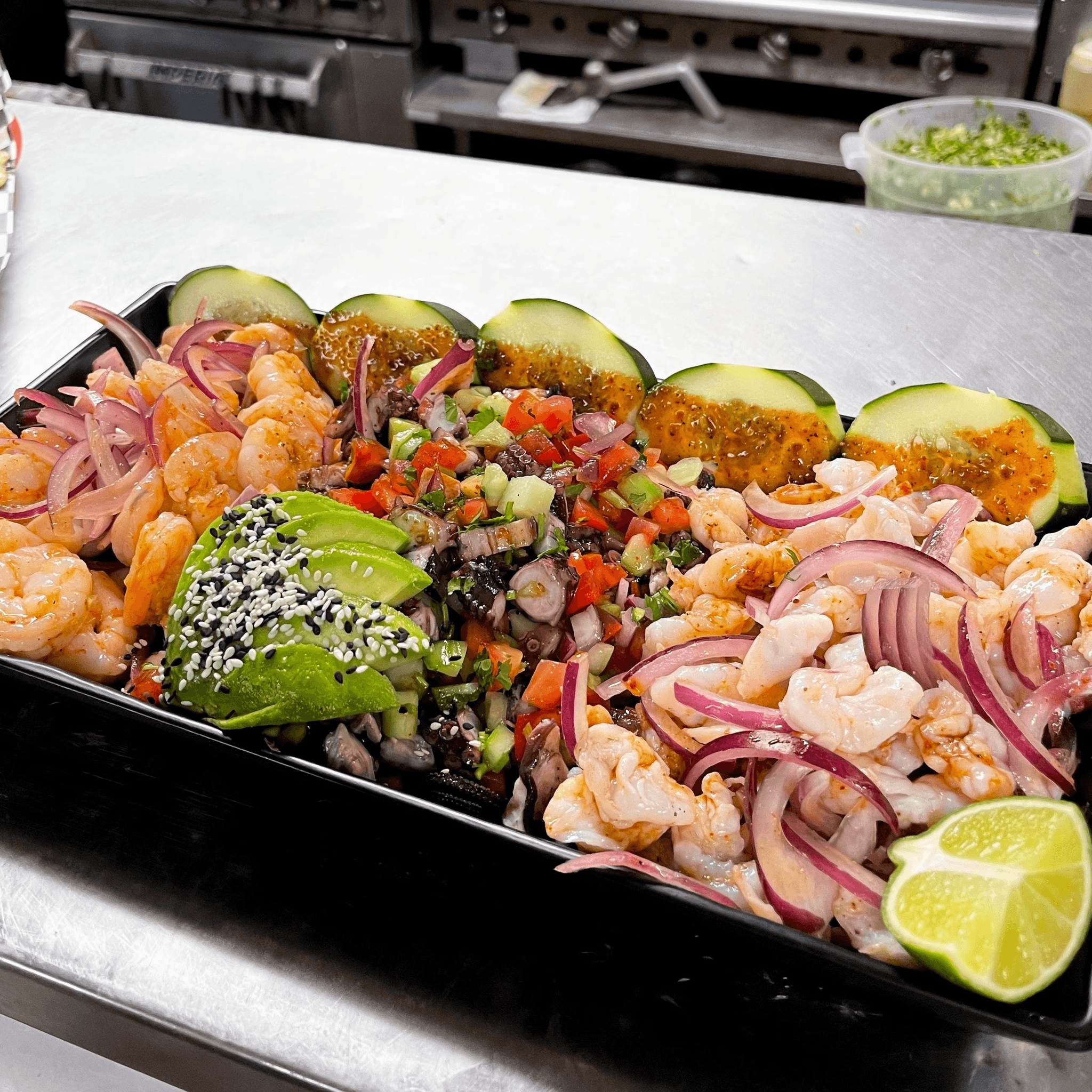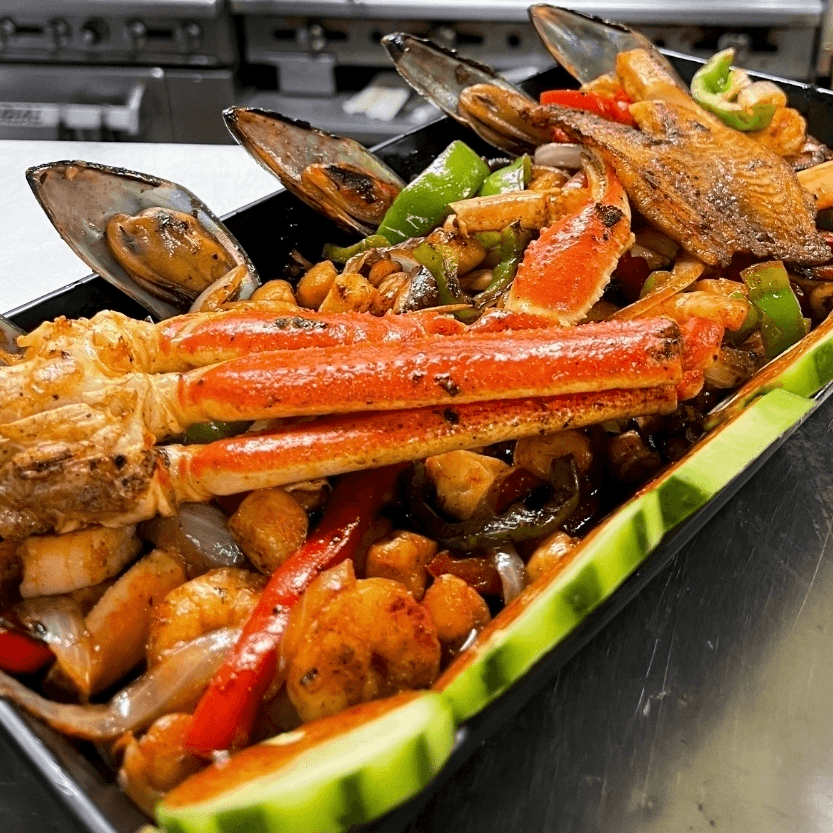 Shrimp, crab legs, octopus, scallops, mussels, fish, grilled onions and bell peppers